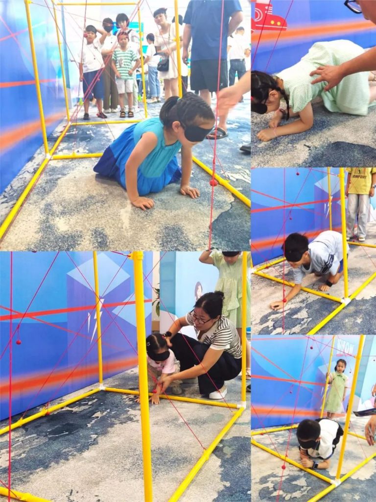 游戲規(guī)則:家庭成員兩人參與挑戰(zhàn),一人戴眼罩參與挑戰(zhàn),另一人道具外指揮,不觸碰網(wǎng)線通過即挑戰(zhàn)成功。